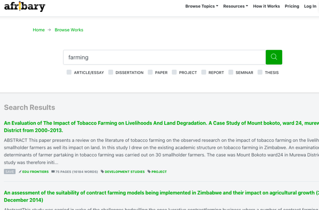 2. Browse through the hundreds of research on farming (you can filter for papers, thesis, articles, dissertations, projects etc) and pick any of the farming related research that meets your interest or needs.